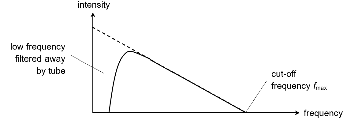 Did you notice that the continuous spectrum is depicted with a minimum frequency (besides the maximum cut-off frequency), which seems to suggest that low frequency photons are not emitted. Actually, the bremsstrahlung process produces more low frequency photons than high frequency photons. Just that in practice, the longer wavelength radiations are naturally absorbed and filtered away by the walls of the x-ray tube.