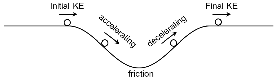 As the filament electron swings around the tungsten nucleus, it actually speeds up when it is approaching the nucleus, but slows down on its way out. But overall, the electron has less KE after its interaction with the nucleus, since some KE has been converted into X-ray photons. This is the reason why bremsstrahlung radiation is also called the braking radiation. This is analogues to a ball rolling through a pit with a rough surface; The ball accelerates while rolling down and decelerates while rolling up. But overall, the ball exits the hole with less KE than it entered with, since some KE has been converted into heat energy.