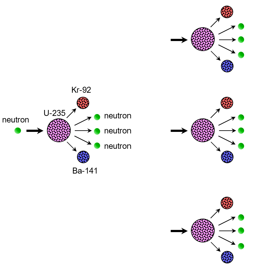 Conveniently, the fission products include 3 neutrons. If these 3 neutrons strike 3 other U-235, they can trigger 3 more fissions. This results in a chain reaction that can be self-sustaining in the nuclear reactor. The power output of nuclear reactors is adjusted using control rods containing elements (boron, cadmium, etc.) which absorb neutrons strongly. If uncontrolled, the exponential nature of the chain reaction results in a nuclear explosion, which is of course disastrous. Having said that, in the only two nuclear disasters in the past (namely the Chernobyl and the Fukushima), the meltdown was not caused by the nuclear fission of the fissile fuel, but the radioactivity of the fission products (such as Ba-141 and Kr-92 in this example), which is the subject of section 18.4.