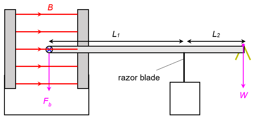 Basically, we are going to measure the magnetic force per unit current per unit length. The setup is called a current balance.