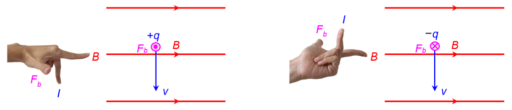 . The thumb and index fingers still point in the direction of Fb and B. The middle finger points in the direction of conventional current produced by the movement of the charge. If the moving charge is positive, point your middle finger in the direction of v. If the moving charge is negative, point your middle finger in the direction opposite to v.