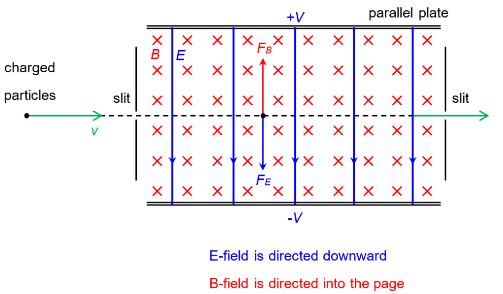 Here comes the crucial bit. The directions of the B and E fields are arranged in such a manner that Fb and Fe are always in opposite directions. Then, by choosing the magnitude of B and E, we can select the velocity at which Fb and Fe are equal in magnitude (but opposite in direction).