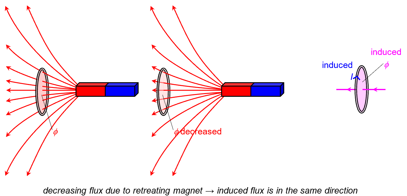 Alternatively, we can see the magnet moving away as the cause of induction. To oppose this change, the coil should (try to) present a south pole to the retreating magnet to keep it from leaving. This requires a clockwise current in the coil. So we arrive at the same conclusion as before.