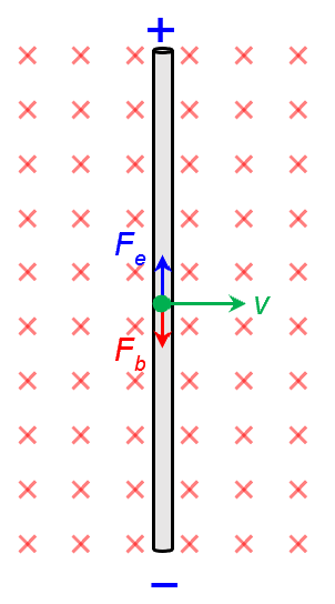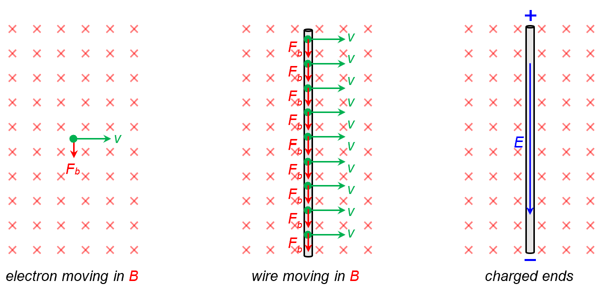 In the diagram above, a wire is moving rightward at speed v. So every electron in the wire experiences a downward magnetic force . Since these are free and mobile electrons, they will shift away from the top and towards the bottom end of the wire. This causes the top and bottom end to become positively and negatively charged respectively. As a result, a downward internal electric field E is formed in the wire.