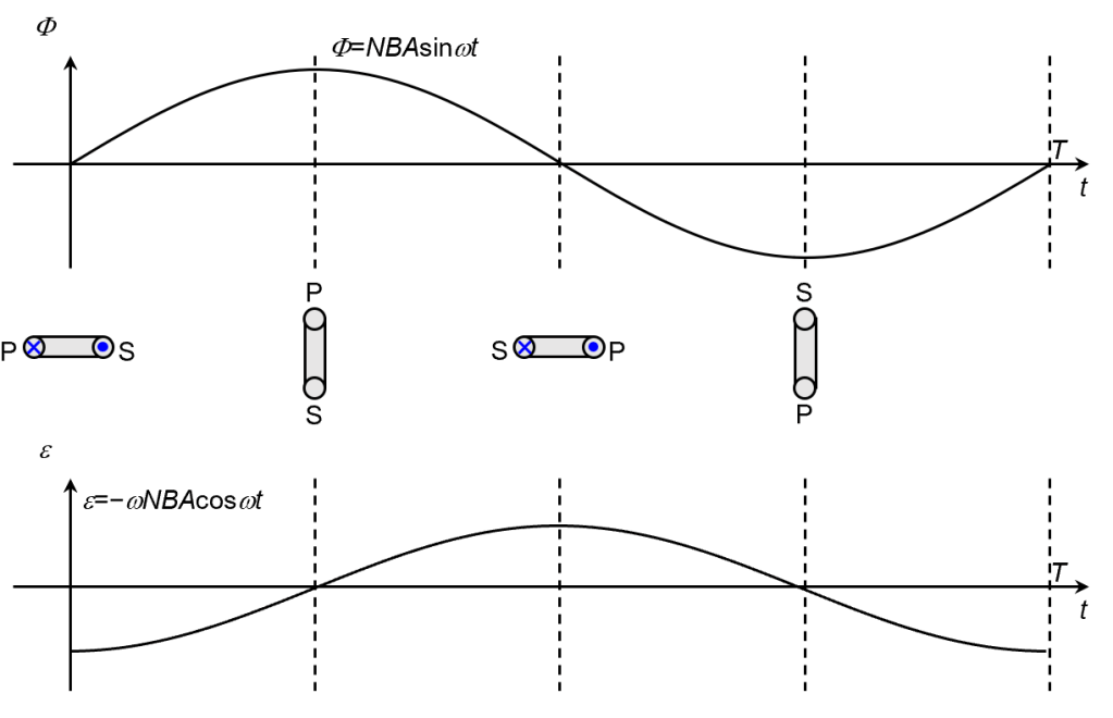 First, we note that the flux linkage of the coil is zero when the coil is horizontal, and maximum when it is vertical. In fact, the flux linkage varies sinusoidally with time because the area of the coil facing B directly varies sinusoidally with time. So we can express