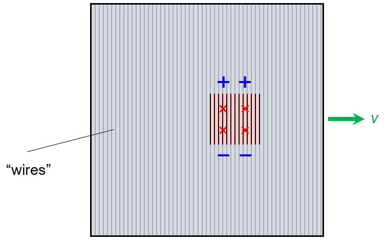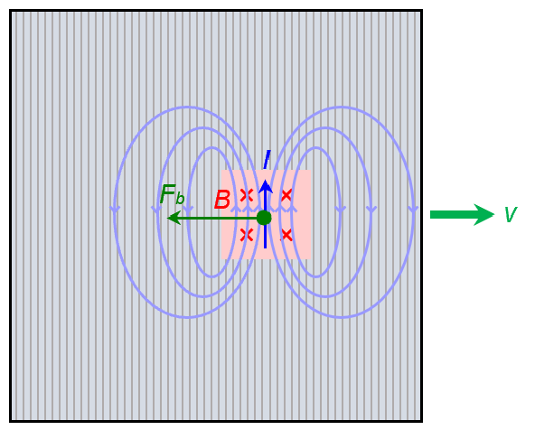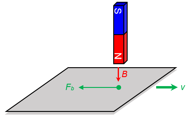 Next, we note that the “wires” under the magnet are now current-carrying conductors moving in a B-field. What does that give us? The magnetic force! Using the FLHR, it is clear that the plate will be experiencing a leftward braking force, an outcome easily predicted by Lenz’s Law.