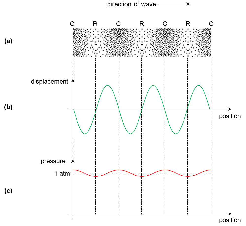 Figure (c) shows the pressure at each position along the wave. Note that the pressure at compressions and rarefactions are only slightly above and below the atmospheric pressure. Even for the noise level of a rock concert, we are talking about a pressure variation of a few pascals only.