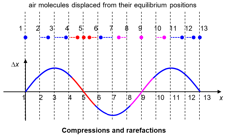 Figure (b) is a displacement-position (Δx–x) graph showing the displacement of air molecules (from their equilibrium positions) at different positions. By convention, a positive displacement represents a rightward displacement, and a negative displacement represents a leftward displacement.