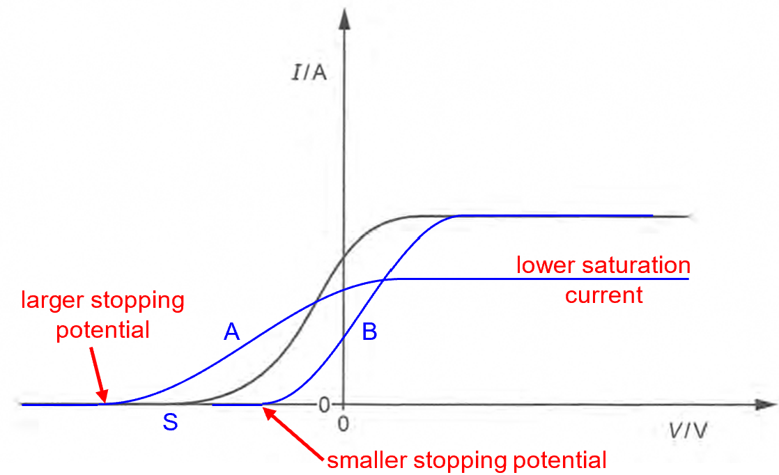 COMMENT: We are also assuming that “same intensity” means the same amount light energy arriving (per unit time per unit area) instead of the same number of photons arriving (per unit time per unit area). So if two beams of light have the intensity, then the beam with the higher frequency of radiation must have less photon (per unit time per unit area) since the energy is delivered in larger packets. With less photons (per unit time per unit area), and assuming that the yield rate is the same, is how we end up with a lower saturation current.