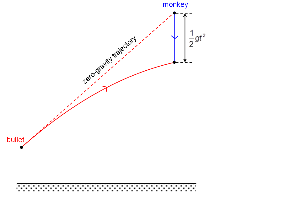 Now let’s switch gravity back on. The bullet would now travel in a parabolic path. At any time, the deviation from the zero-gravity-straight-line path is a vertical distance of 0.5gt2. What about the moneky? It would also have fallen down by a distance of 0.5gt2. Because gravity affected both motions equally, gravity or not, the monkey is doomed to be hit.