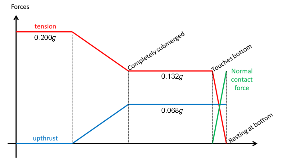 The graph below shows how the forces of tension, upthrust and the normal contact force (that the beaker exerts on the bob) vary as the bob was lowered. (Note that the reading on the weighing balance corresponded to the upthrust and normal contact force.)