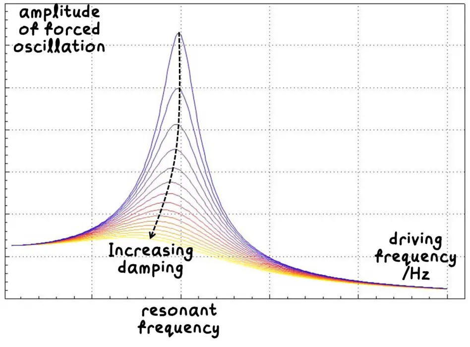 So if the degree of damping is high, the forced oscillation will reach the equilibrium state at a smaller amplitude. (Kind of similar to why larger air resistance results in lower terminal velocity for falling objects) This explains why the stronger the damping, the lower the resonance peak.