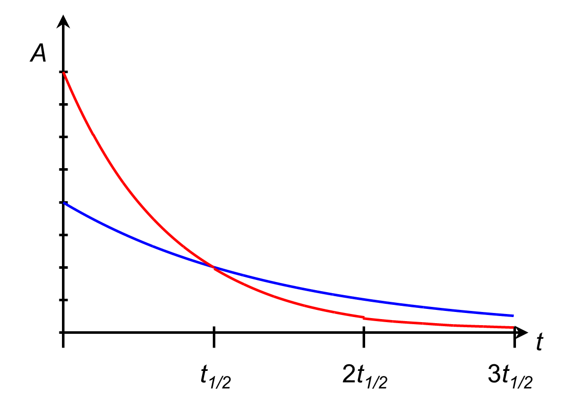 COMMENT: The graph below depicts the situation if red sample has twice the decay constant as the blue. The two activities are equal within 1 half-life of the blue sample.